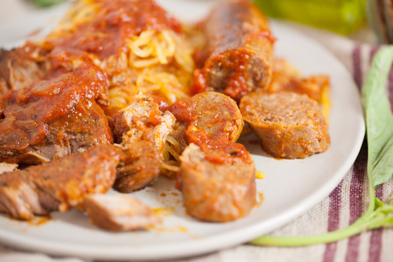 - To serve, fish out the sausage and pork from the simmering sauce and place into a serving bowl. Plate pasta (saving room to serve the meat alongside) and top with your desired amount of sauce. Buon appetito!